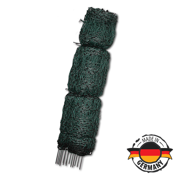 The green electric poultry nets have 12 horizontal strands of which 11 are electrified. The top strand is 80% stronger than the rest of the strands to ensure your netting maintains its integrity. Either or both ends of the fence can be connected to the energiser and to the net can be run either in a straight length or looped back to form an enclosed area. Fence lengths can easily be connected to form longer runs. Each 50m fence incorporates 14 plastic posts with steel dual-prong feet. All the above three nets come with ground skewers to keep the fence tighter to the ground in undulating areas. The Standard and Tall nets also included the plastic corner pegs. The 120cm electric poultry nets has this mesh spacing โ€“ 2*20cm, 2 *15cm, 3*10cm, 4*5cm. Vertical mesh spacing is 7.5cm.