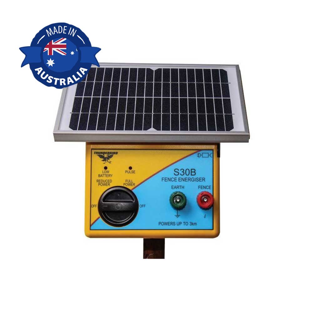 The S30B Thunderbird Solar Electric Fence Energiser is capable of powering up to 2.5km of normal fencing wire, or 50m of electric netting. Therefore this model is a good starter energiser for those who want a portable energiser with enough power to suit a small fencing application.